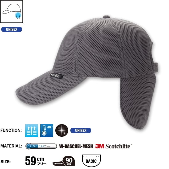 軽量で通気性に優れ、型くずれしにくい素材を使った、熱射、防暑対策に嬉しい機能性が高い付加価値キャップです。顔の表面温度上昇を防ぐと共に熱射・紫外線から後頭部・首筋を守り、ツバ部の高輝度反射テープにより夕刻から夜間の安全性が向上しています。